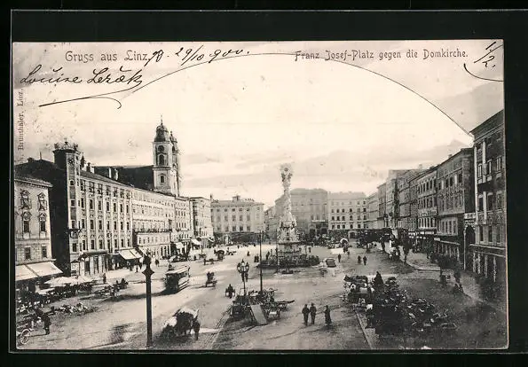 AK Linz a. D., Franz-Josef-Platz gegen die Domkirche, Strassenbahn