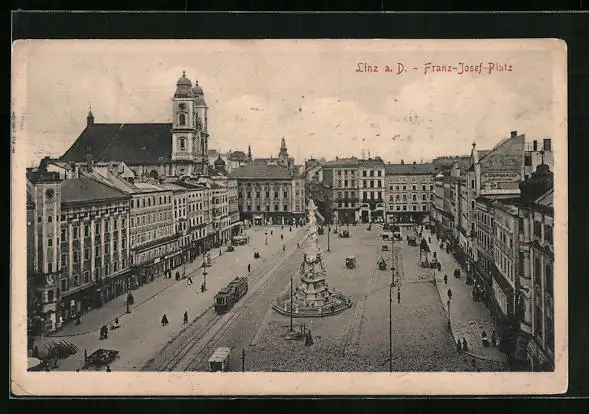 AK Linz a. D., Franz Josef-Platz mit Geschäften und Denkmal, Strassenbahn