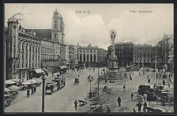AK Linz a. D., Franz Josef-Platz mit Strassenbahn aus der Vogelschau