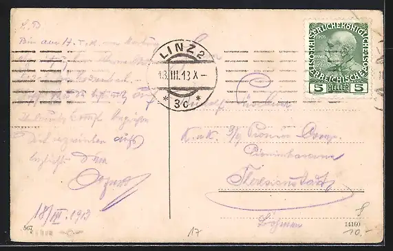 gelaufen 1913, Eckknick oben li., guter Zustand