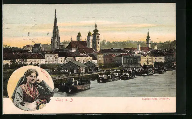 AK Linz a. D., Gesamtansicht, Linzerin im Trachtenkleid
