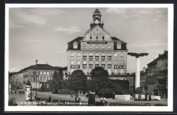 AK Linz a. D., Hotel Weinzinger und Pionierdenkmal