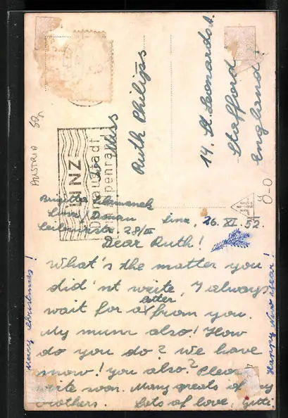 Personenbezogene Daten auf der Rückseite der Karte wurden durch blauen Textmarker unkenntlich gemacht. Die blauen Stellen sind auf die Vorderseite durchgeweicht und wirken sich negativ auf das Postkartenfoto aus
