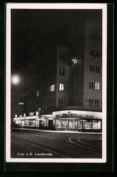 AK Linz a. D., Landstrasse bei Nacht mit Geschäft Palmers