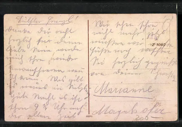 Personenbezogene Daten auf der Rückseite der Karte wurden durch blauen Textmarker unkenntlich gemacht. Die blauen Stellen sind auf die Vorderseite durchgeweicht und wirken sich negativ auf das Postkartenfoto aus