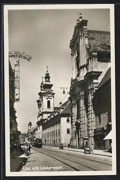 AK Linz a. D., Landstrasse mit Strassenbahn