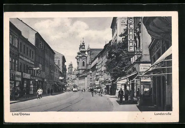 AK Linz a. D., Landstrasse mit Strassenbahn und Passanten