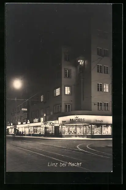 AK Linz a. D., Linz bei Nacht, Strassenpartie mit Geschäft