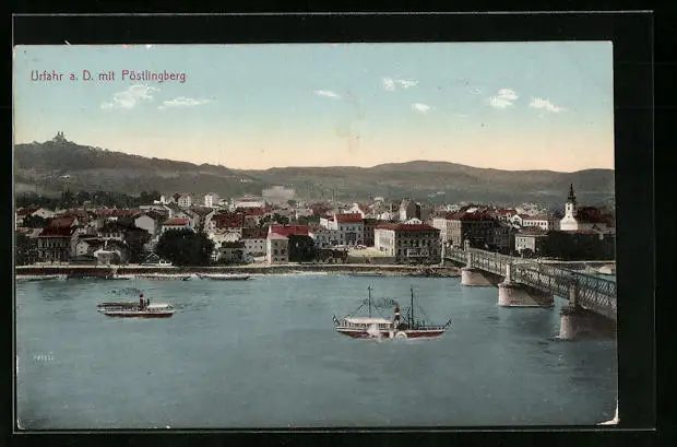 AK Linz a. D., Ortsansicht mit Pöstlingberg, Flusspartie mit Dampfer