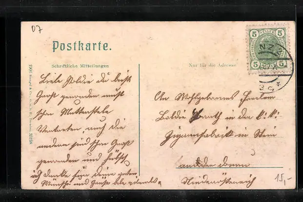 alte Ansichtskarte, gelaufen 1907, Stempelspur, guter Zustand