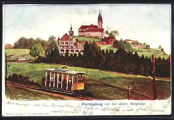 AK Linz a. D., Pöstlingberg mit der elektr. Bergbahn, Strassenbahn