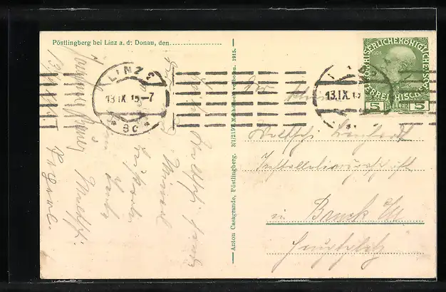 gelaufen 1915, Eckknick re. unten, guter Zustand