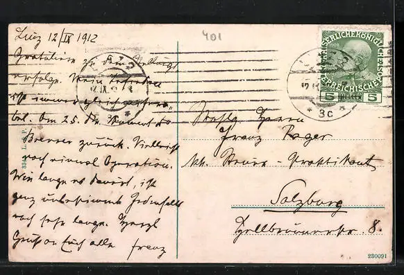 gelaufen 1912, Eckknick oben re., Ecken bestoßen, Stempelspur, guter Zustand