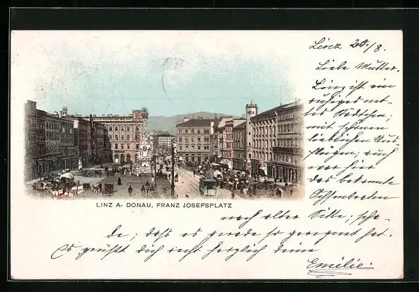 AK Linz a. D., Strassenbahn am Franz Josefplatz