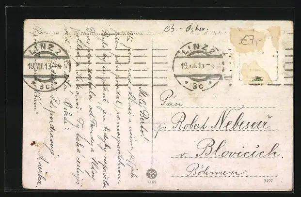gelaufen 1913, Briefmarke entfernt, rückseitig Oberflächenschaden, guter Zustand
