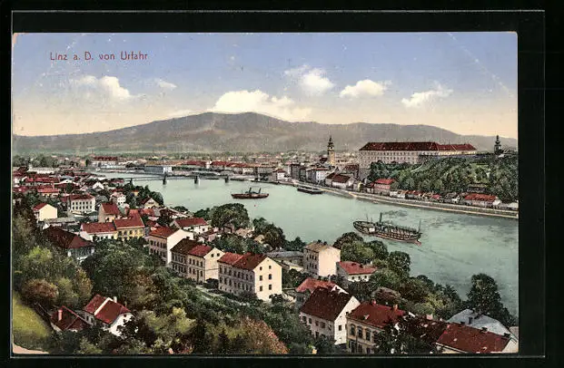 AK Linz a. D., Teilansicht von Urfahr mit Dampfern