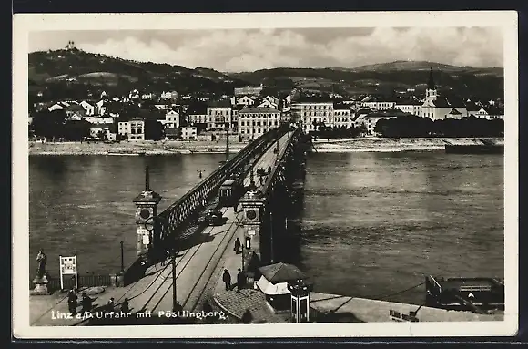 AK Linz a. D., Urfahr mit Pöstlingberg, Brücke und Strassenbahn