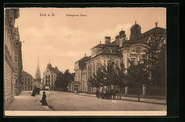 AK Linz a. D., Volksgarten Salon mit Passanten