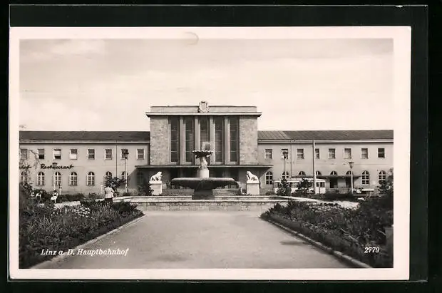 AK Linz a. d. D., Hauptbahnhof mit Bahnof-Restaurant und Brunnen