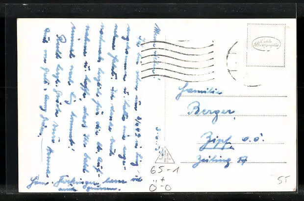 Personenbezogene Daten auf der Rückseite der Karte wurden durch blauen Textmarker unkenntlich gemacht. Die blauen Stellen sind auf die Vorderseite durchgeweicht und wirken sich negativ auf das Postkartenfoto aus