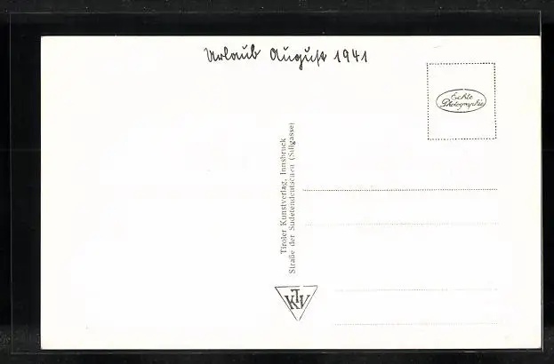 Personenbezogene Daten auf der Rückseite der Karte wurden durch blauen Textmarker unkenntlich gemacht. Die blauen Stellen sind auf die Vorderseite durchgeweicht und wirken sich negativ auf das Postkartenfoto aus