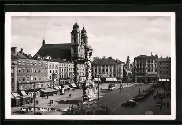 AK Linz a. d. D., Strassenbahn auf dem platz, Pestsäule und Geschäfte