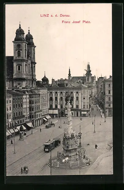 AK Linz a. d. D., Strassenbahn passiert die Pestsäule auf dem Franz Josefs-Platz