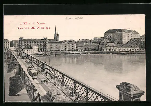 AK Linz a. d. D., Teilansicht und Brücke mit Strassenbahn