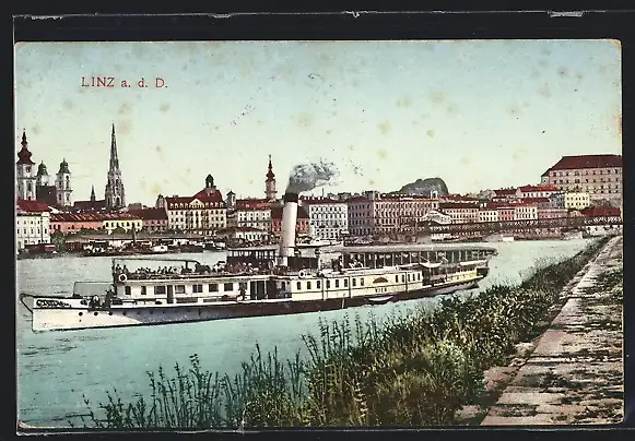 AK Linz a. d. D., Uferpartie mit Dampfer