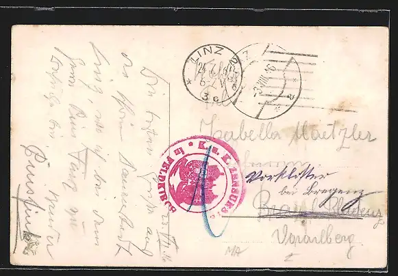 gelaufen 1916, Briefmarke entfernt, rückseitig Oberflächenschaden, guter Zustand