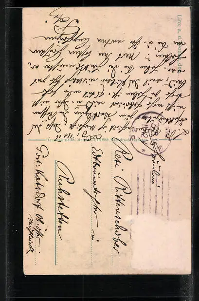 Personenbezogene Daten auf der Rückseite der Karte wurden durch blauen Textmarker unkenntlich gemacht. Die blauen Stellen sind auf die Vorderseite durchgeweicht und wirken sich negativ auf das Postkartenfoto aus
