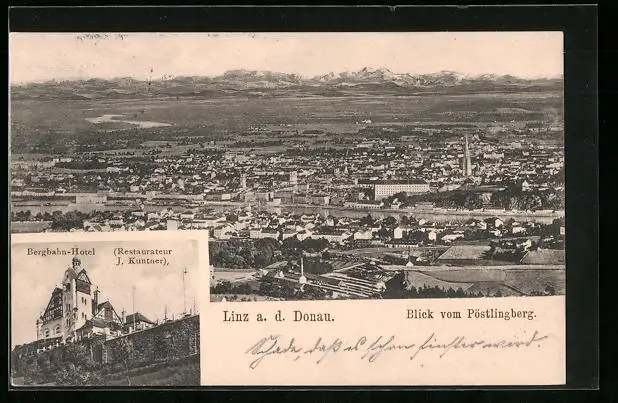 AK Linz a. d. Donau, Blick vom Pöstlingberg mit Bergbahn-Hotel