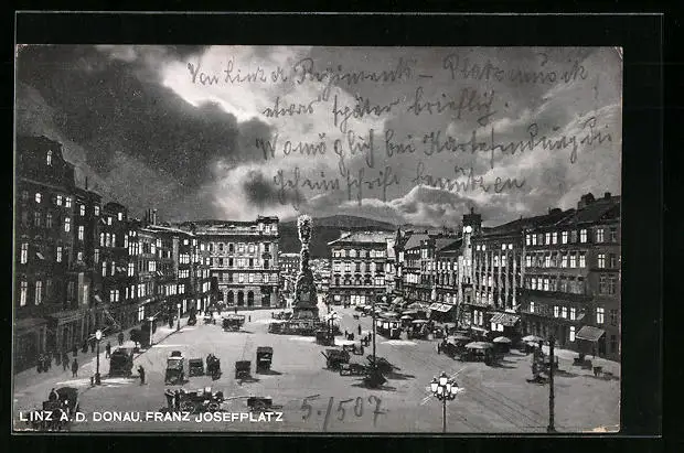 AK Linz a. d. Donau, Franz Josefplatz im Mondschein