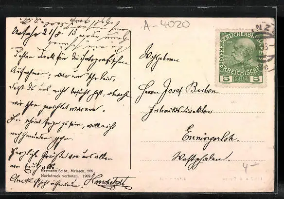 alte Ansichtskarte, gelaufen 1913, Eckknick li. unten, Stempelspur, Bugspur li. oben, guter Zustand