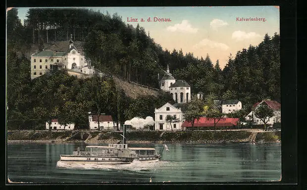 AK Linz a. d. Donau, Kalvarienberg mit Ausflugsdampfer