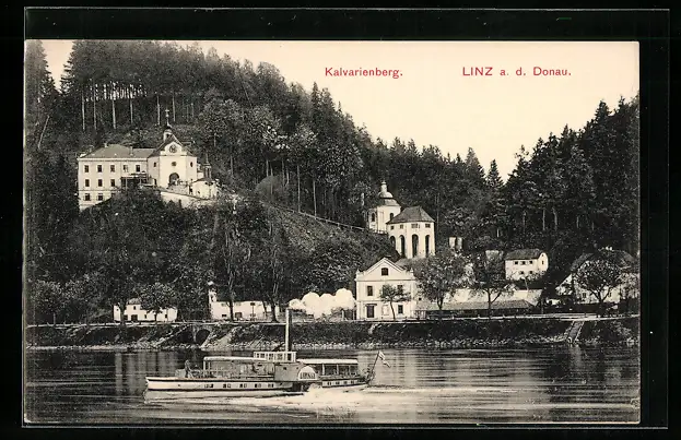 AK Linz a. d. Donau, Kalvarienberg mit Dampfer