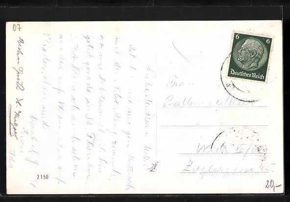 Personenbezogene Daten auf der Rückseite der Karte wurden durch blauen Textmarker unkenntlich gemacht. Die blauen Stellen sind auf die Vorderseite durchgeweicht und wirken sich negativ auf das Postkartenfoto aus