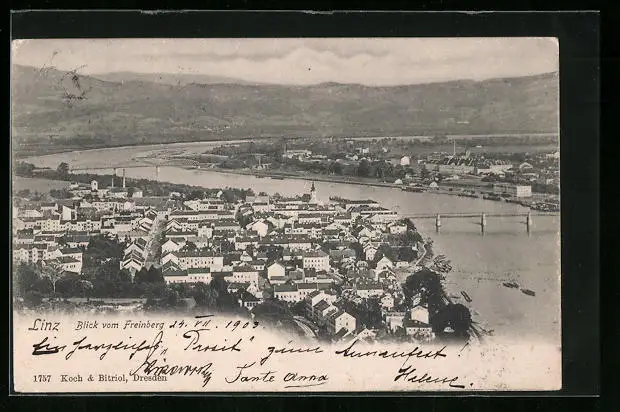 AK Linz a. d. Donau, Ortspartie mit Donaubrücken