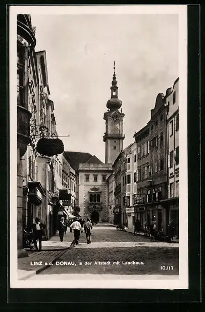AK Linz a. d. Donau, Passanten in der Altstadt mit Landhaus