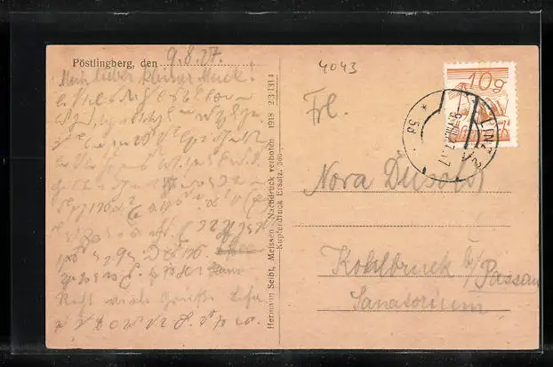 Personenbezogene Daten auf der Rückseite der Karte wurden durch blauen Textmarker unkenntlich gemacht. Die blauen Stellen sind auf die Vorderseite durchgeweicht und wirken sich negativ auf das Postkartenfoto aus