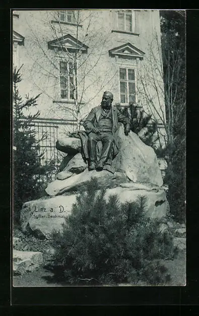 AK Linz a. d. Donau, Stifter-Denkmal vor einem Haus