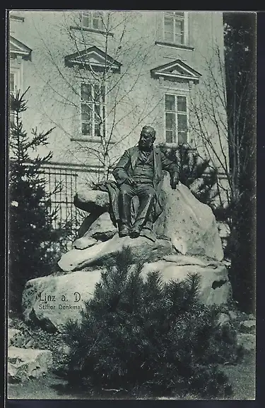 AK Linz a. d. Donau, Stifter-Denkmal vor einem Haus