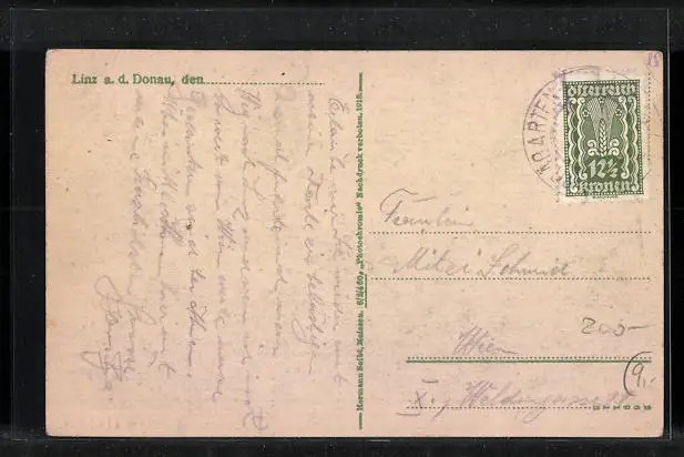 Personenbezogene Daten auf der Rückseite der Karte wurden durch blauen Textmarker unkenntlich gemacht. Die blauen Stellen sind auf die Vorderseite durchgeweicht und wirken sich negativ auf das Postkartenfoto aus