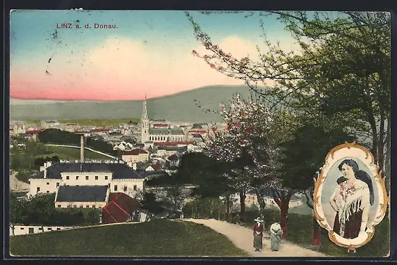 AK Linz a. d. Donau, Teilansicht mit Kirche, Frau in Tracht