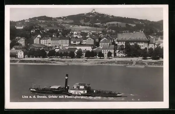 AK Linz a. d. Donau, Urfahr mit Pöstlingberg, Flusspartie mit Dampfer Jean Millot