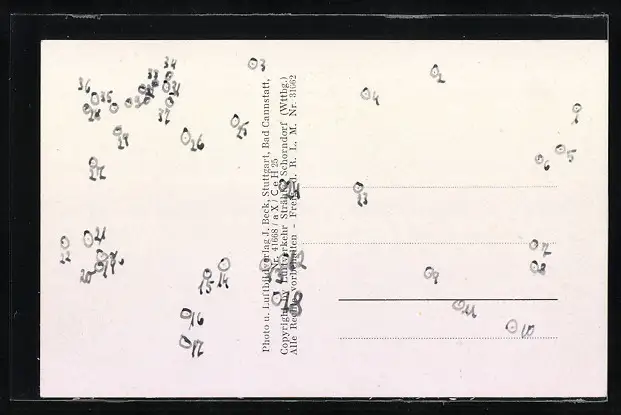 Personenbezogene Daten auf der Rückseite der Karte wurden durch blauen Textmarker unkenntlich gemacht. Die blauen Stellen sind auf die Vorderseite durchgeweicht und wirken sich negativ auf das Postkartenfoto aus