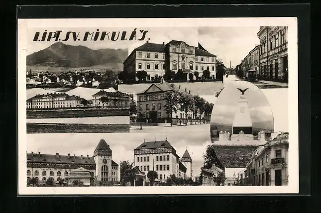 AK Liptovský Mikulás, Ortsansicht, Denkmal, Strassenpartie und Gebäude, Fotomontage