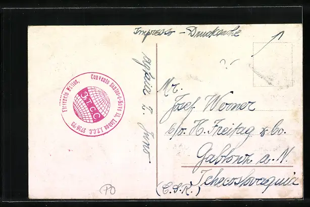 Personenbezogene Daten auf der Rückseite der Karte wurden durch blauen Textmarker unkenntlich gemacht. Die blauen Stellen sind auf die Vorderseite durchgeweicht und wirken sich negativ auf das Postkartenfoto aus