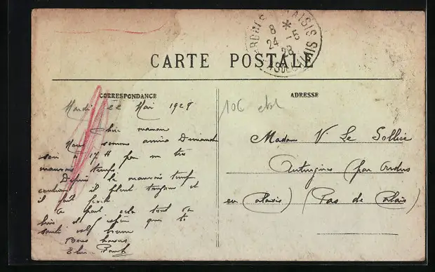 Personenbezogene Daten auf der Rückseite der Karte wurden durch blauen Textmarker unkenntlich gemacht. Die blauen Stellen sind auf die Vorderseite durchgeweicht und wirken sich negativ auf das Postkartenfoto aus
