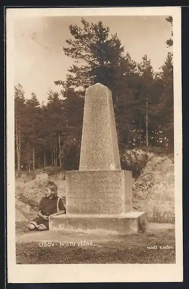 AK Lisov, Mädchen neben einem Denkmal sitzend